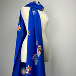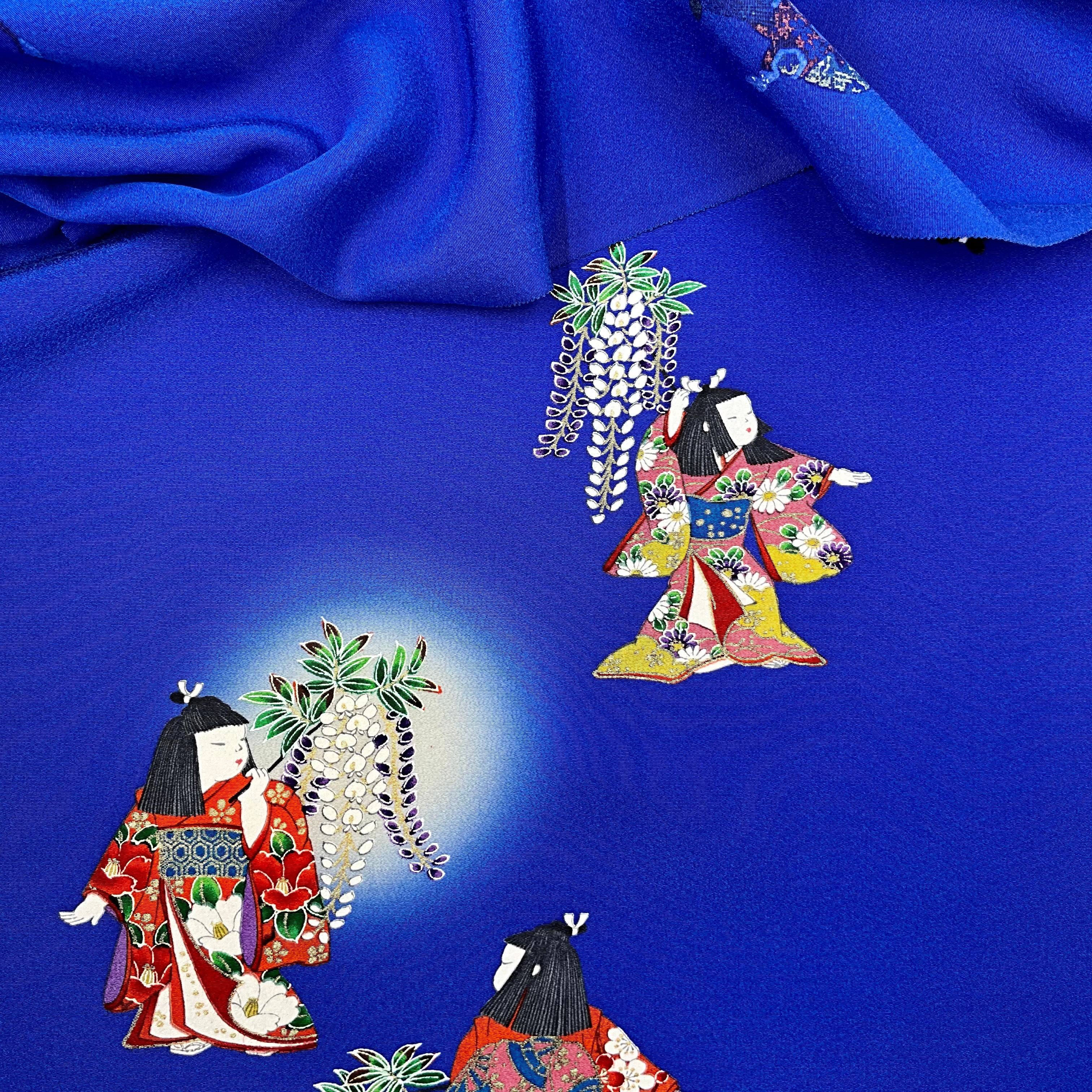 • Textile: Vintage Japanese silk with a dyed pattern of girls dancing with wisteria blossoms on a cobalt blue base. As with most Kimono silk fabrics, the pattern alternates up and down