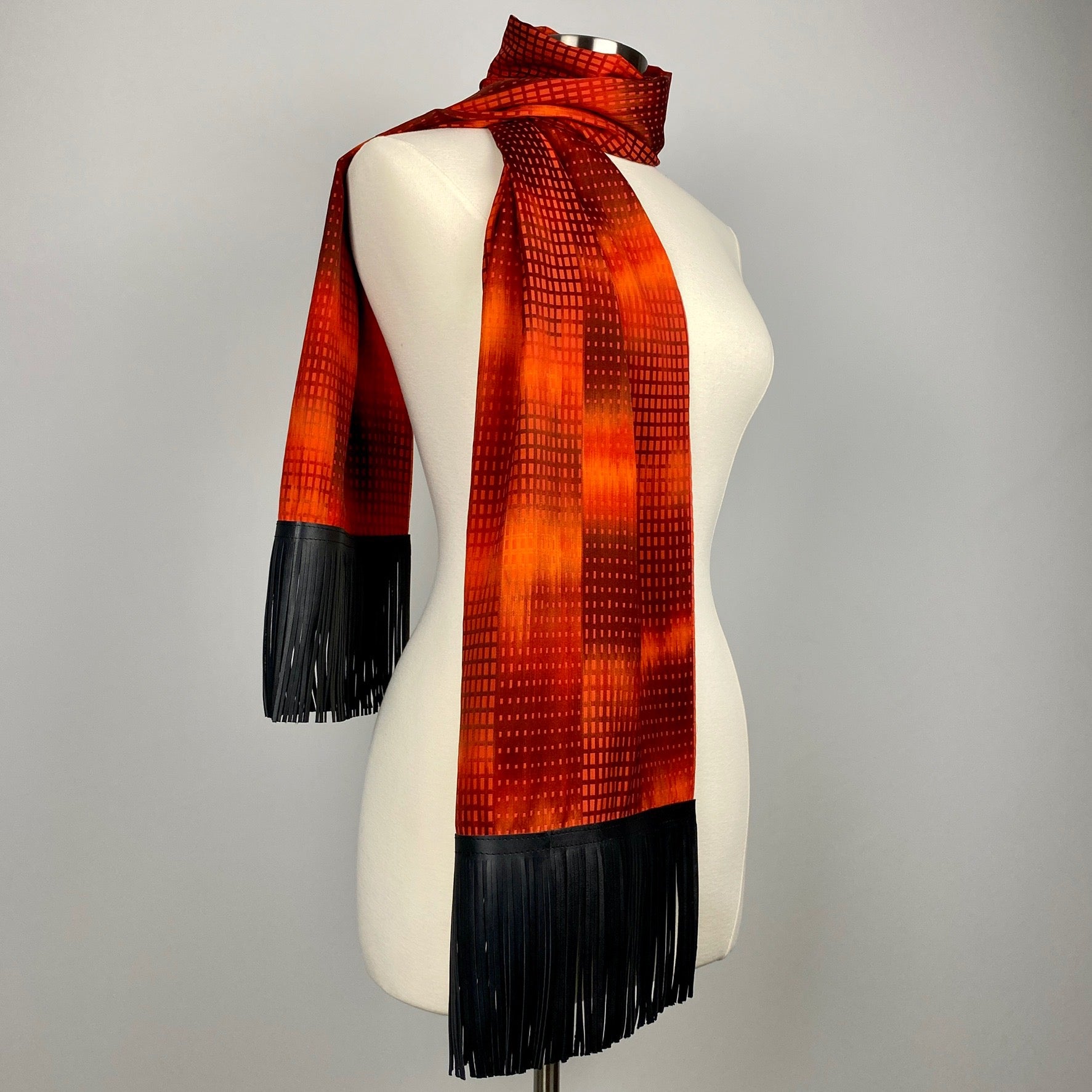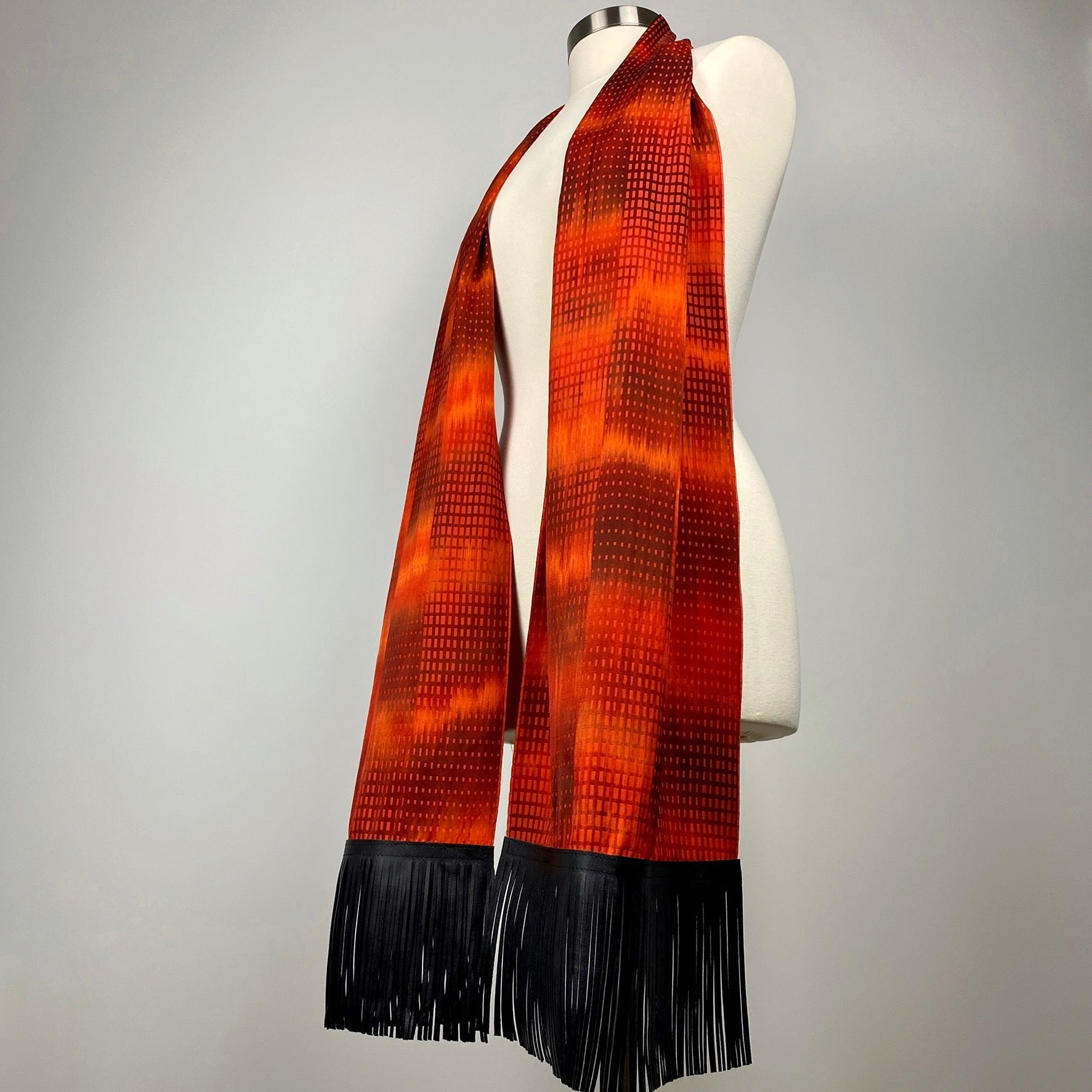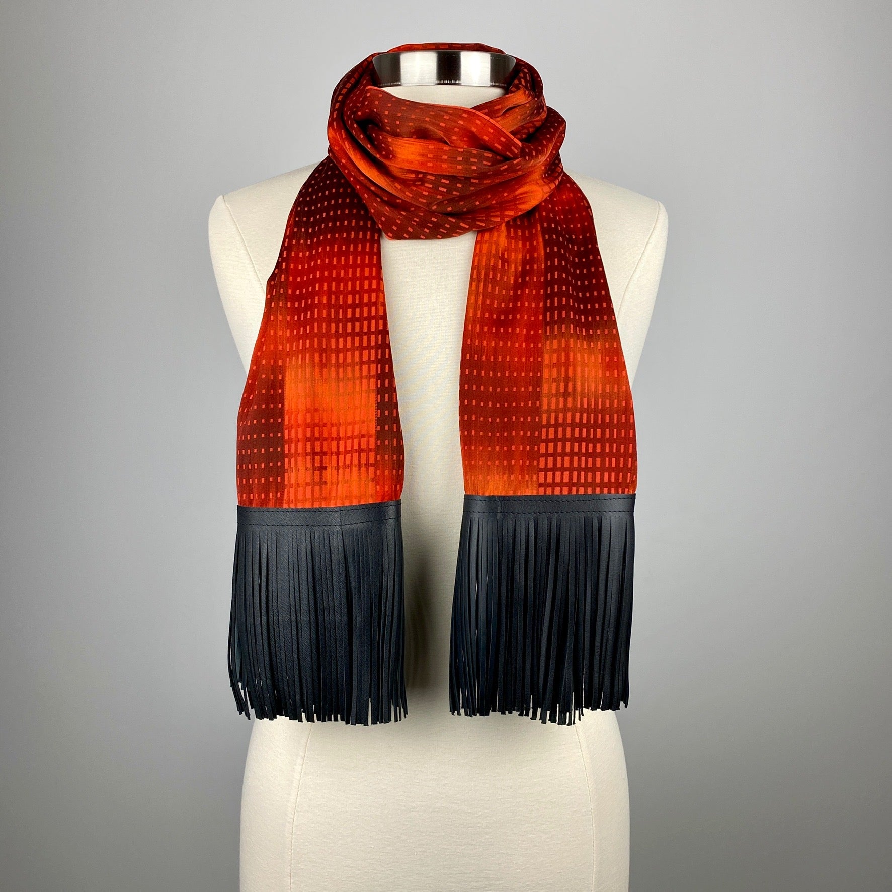• Size:  Approximately 85 x 14" (216 x 36 cm) including leather fringe. Oblong scarf