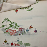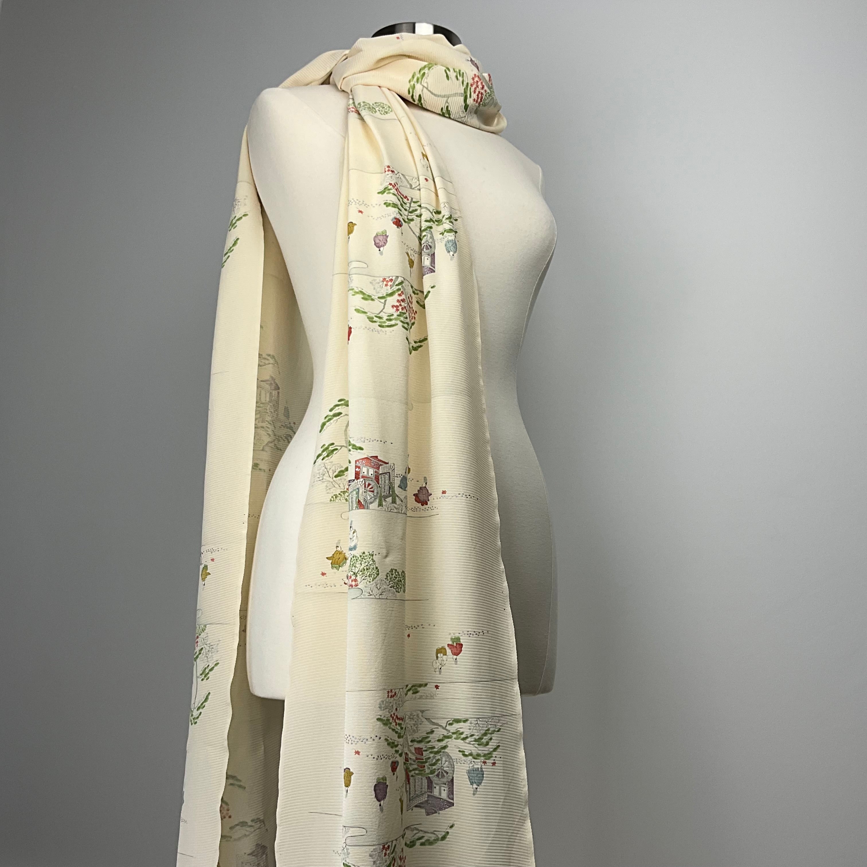 • Textile: Vintage 1950's semi sheer Ro silk with an exquisite hand painted scenery of noble people on a journey with carts. Cream color background. Edges are discolored but not so noticeable when wearing. The exact pattern layout on your scarf may vary somewhat from photos. As with most Kimono fabrics, the patterns typically alternate up and down as shown in the photos