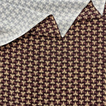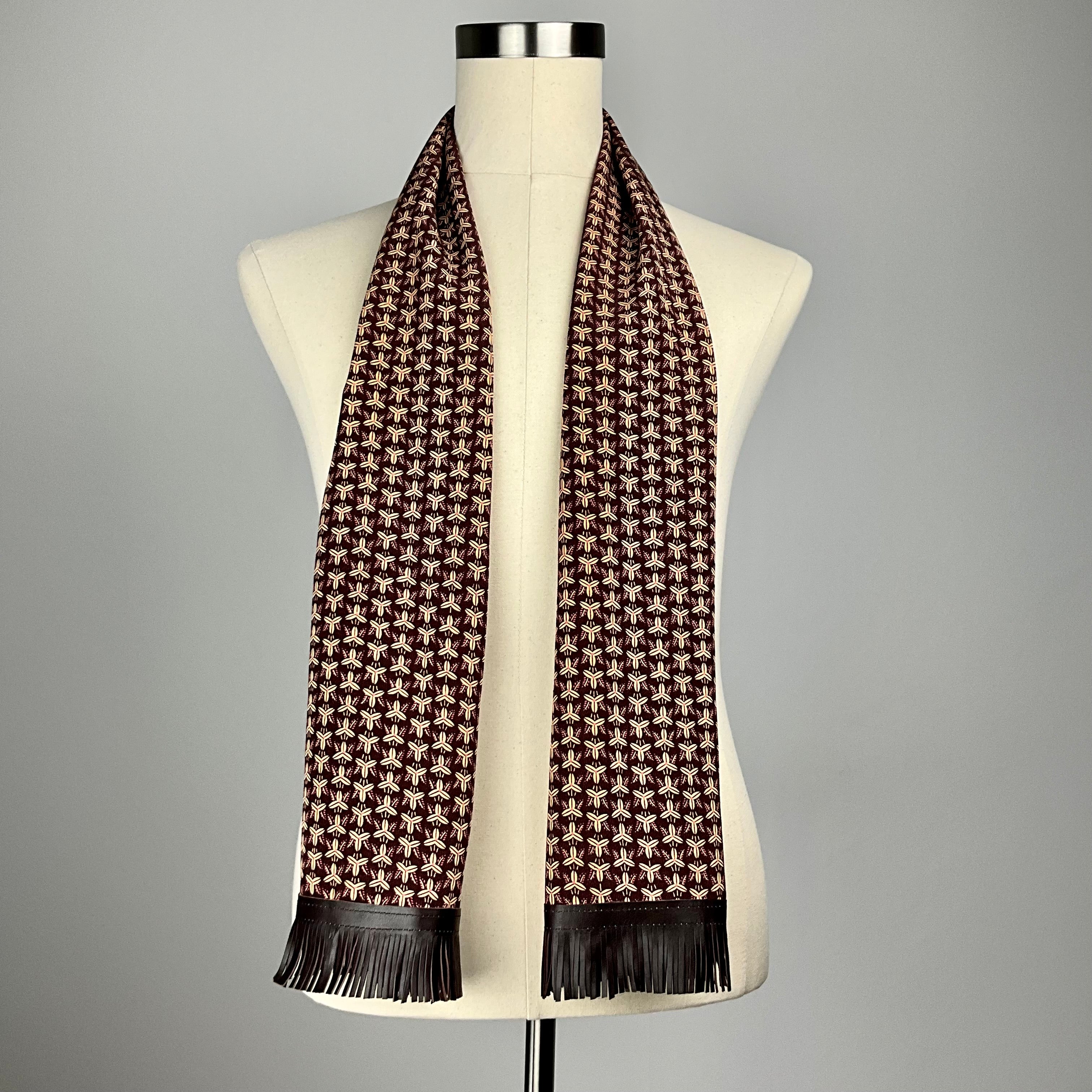 A brown and beige silk scarf with a geometric paulownia crest. The scarf has brown leather fringe and is tied as a double ascot.
