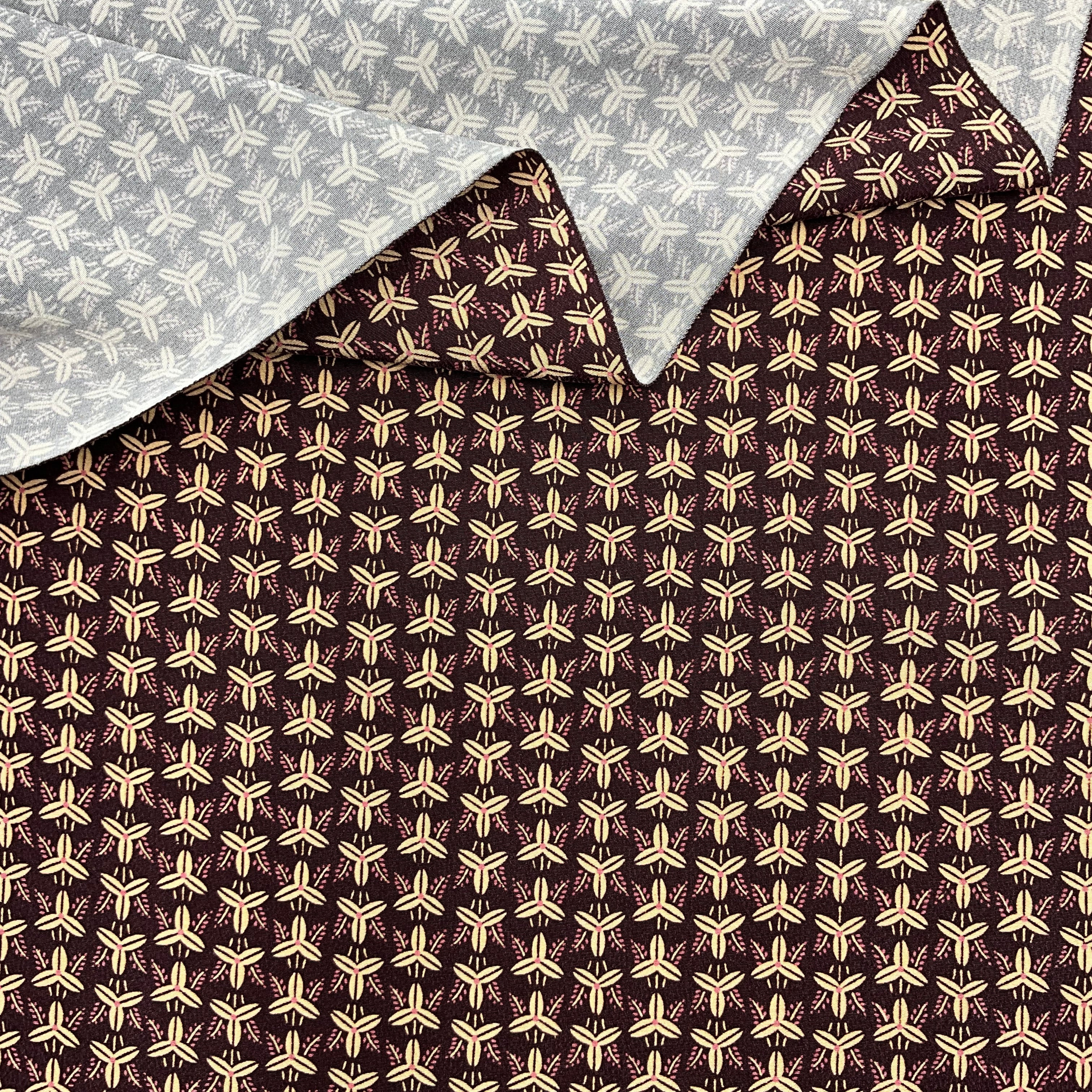 • Textile: Soft silk that was originally made for a Komon Kimono. It has a geometrical Paulownia crest design of beige with tiny pink accents on a brown base. The back of the silk is off-white