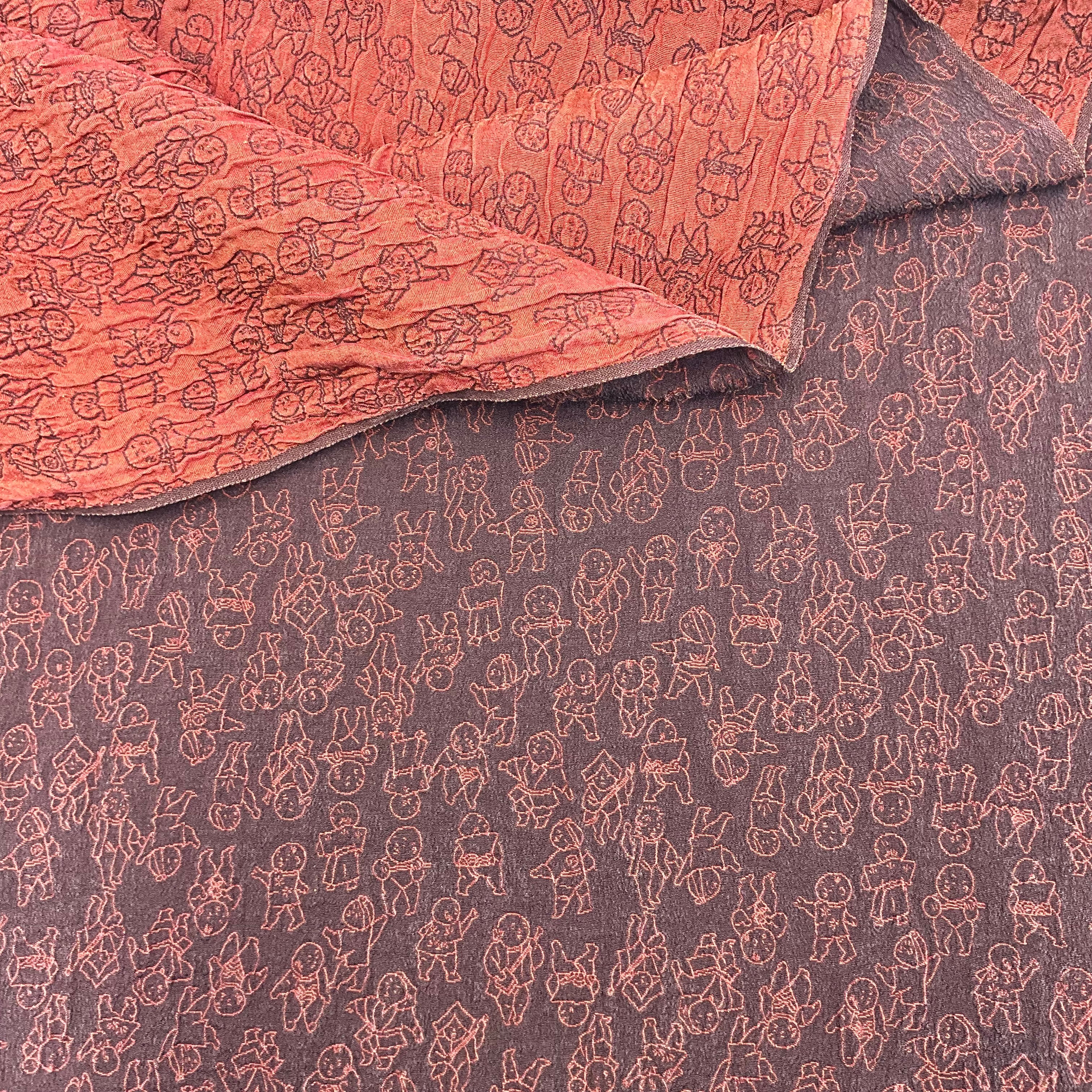• Textile: Pattern of Karako  (唐子) figures with musical instruments, dancing and playing. Double sided woven silk. Black leather fringe