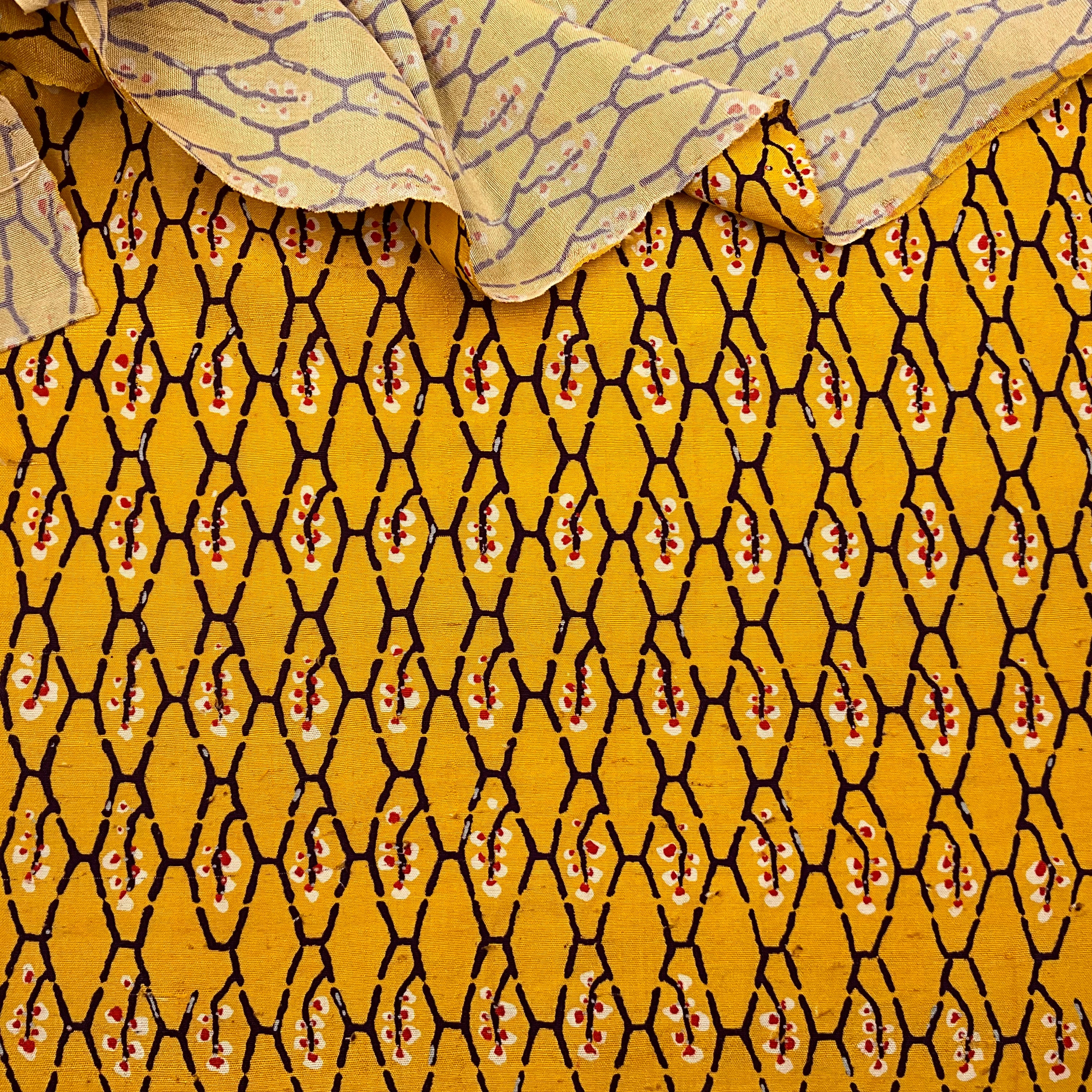• Textile: Dyed dark purple net pattern with abstract Japanese plum (Ume 梅) blossom buds on a vibrant yellow base. The net lines look more black in photos here, but are actually dark purple. Mid 20th century Japanese silk with a soft, cotton like feel. It has some dyestuff flaws and tiny snags. The dyestuff flaws may be noticeable when wearing, but do not detract from the overall look