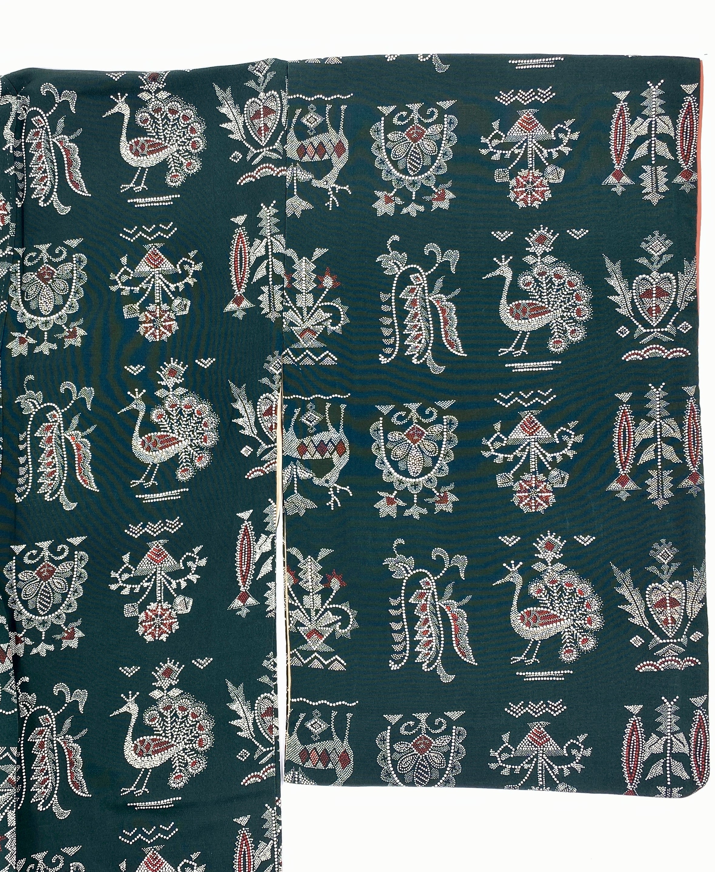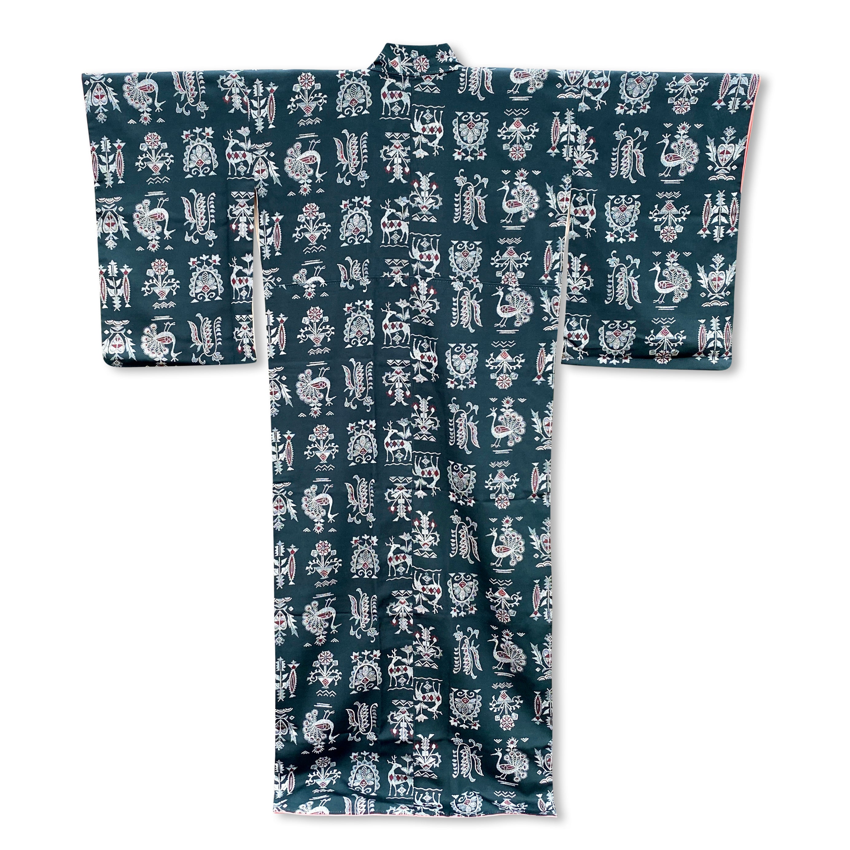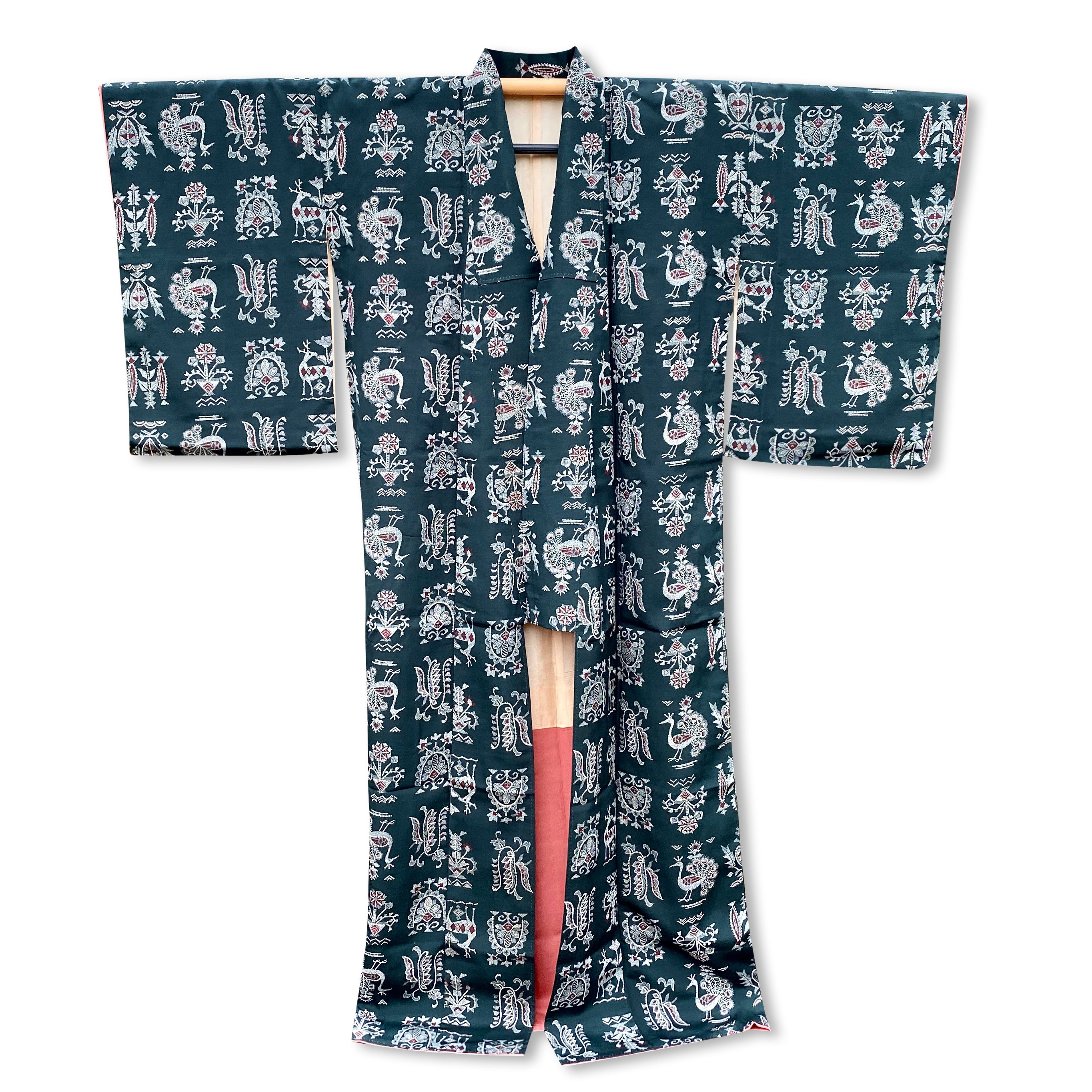 • Fabric & Pattern:  100% silk exterior and lining. It is a Komon Kimono, which is for informal occasions such as shopping in town, visiting friends, or traveling. Delightful pattern of peacock, deer, & flowers, which is dyed