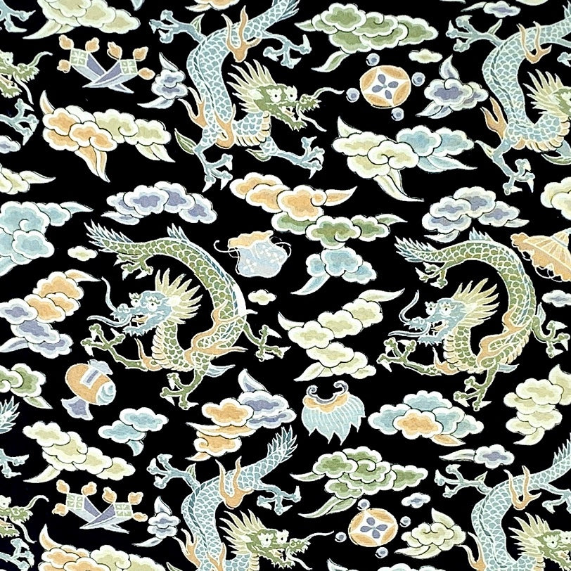 • Textile: Vintage pre-1940 Japanese silk that we stabilize with a backing material for longevity. This rich pattern depicts the azure dragon and 'takara-zukushi'