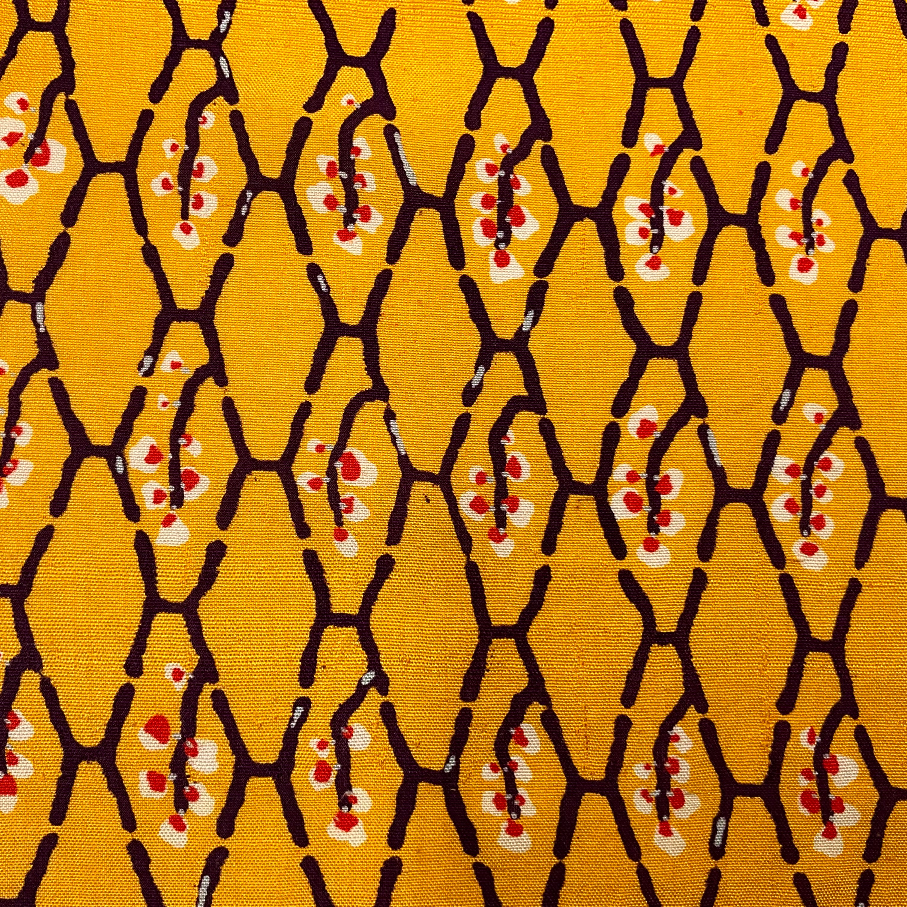 • Textile: Dyed dark purple net pattern with abstract Japanese plum (Ume 梅) blossom buds on a vibrant yellow base. The net lines look more black in photos here, but are actually dark purple. Mid 20th century Japanese silk with a soft, cotton like feel. It has some dyestuff flaws and tiny snags. The dyestuff flaws may be noticeable when wearing, but do not detract from the overall look