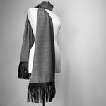 • Scarf Dimensions:  Choice of 85" (216 cm) or 61" (155 cm) including your choice of leather fringe. Width approximately 14" (35 cm). Oblong