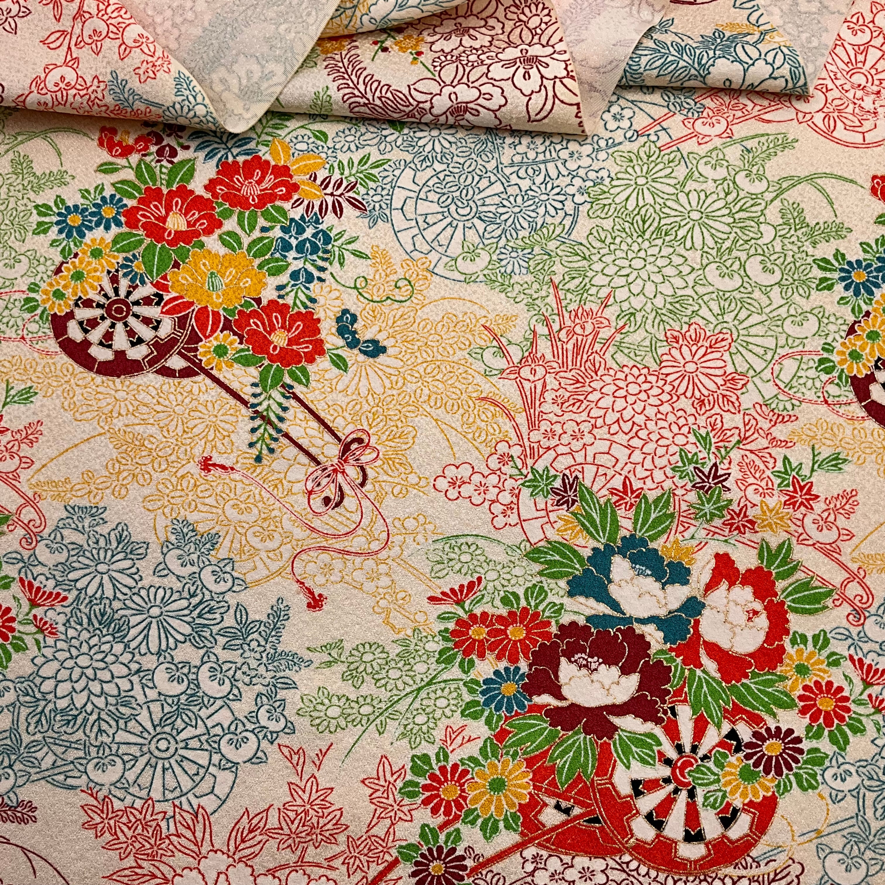 • Textile: Vintage Japanese silk scarf with a dyed motif of multi colored flower carts (花車, Hanaguruma). Base color light beige. Textile is from the pre-1960's. The pattern layout of your scarf may vary slightly from the photos here