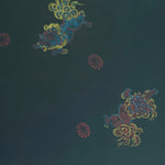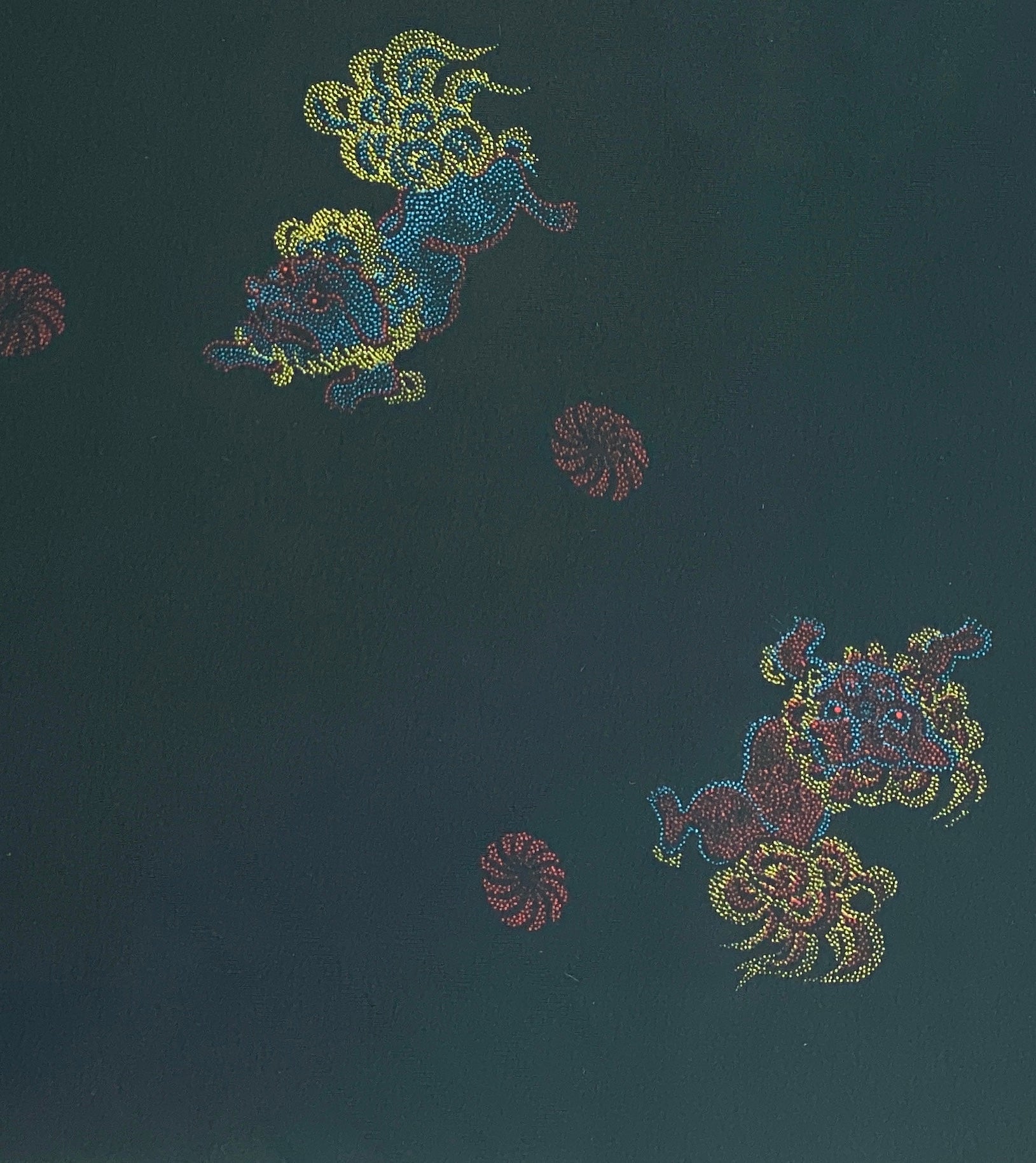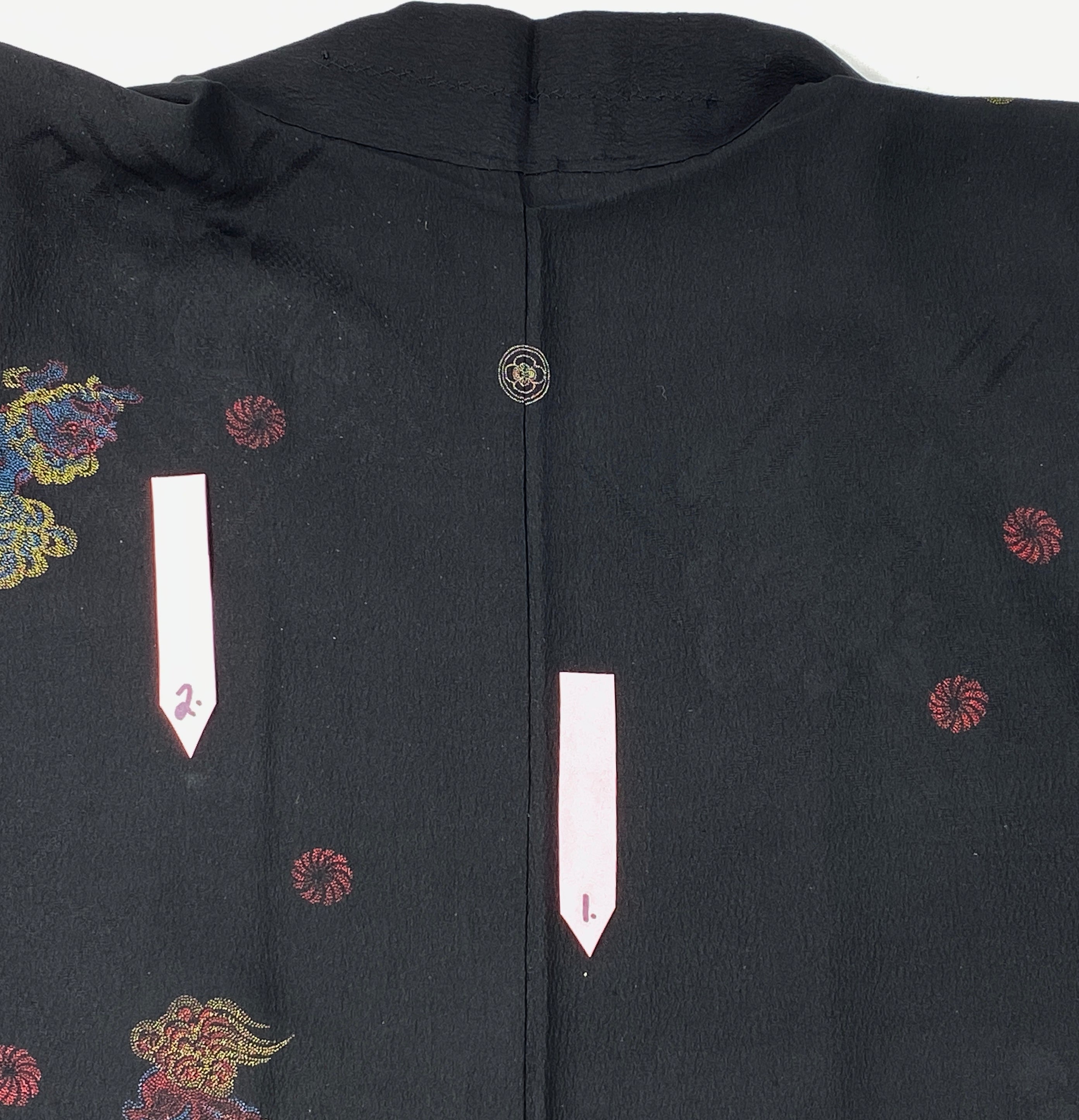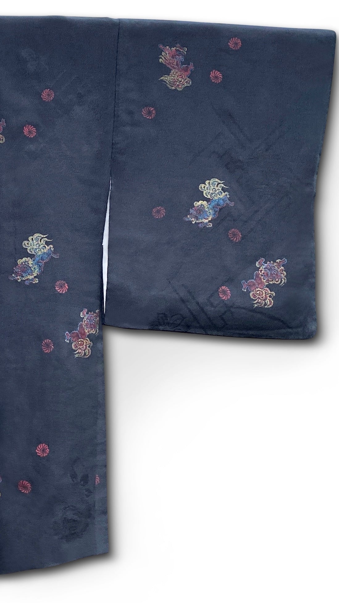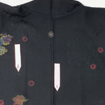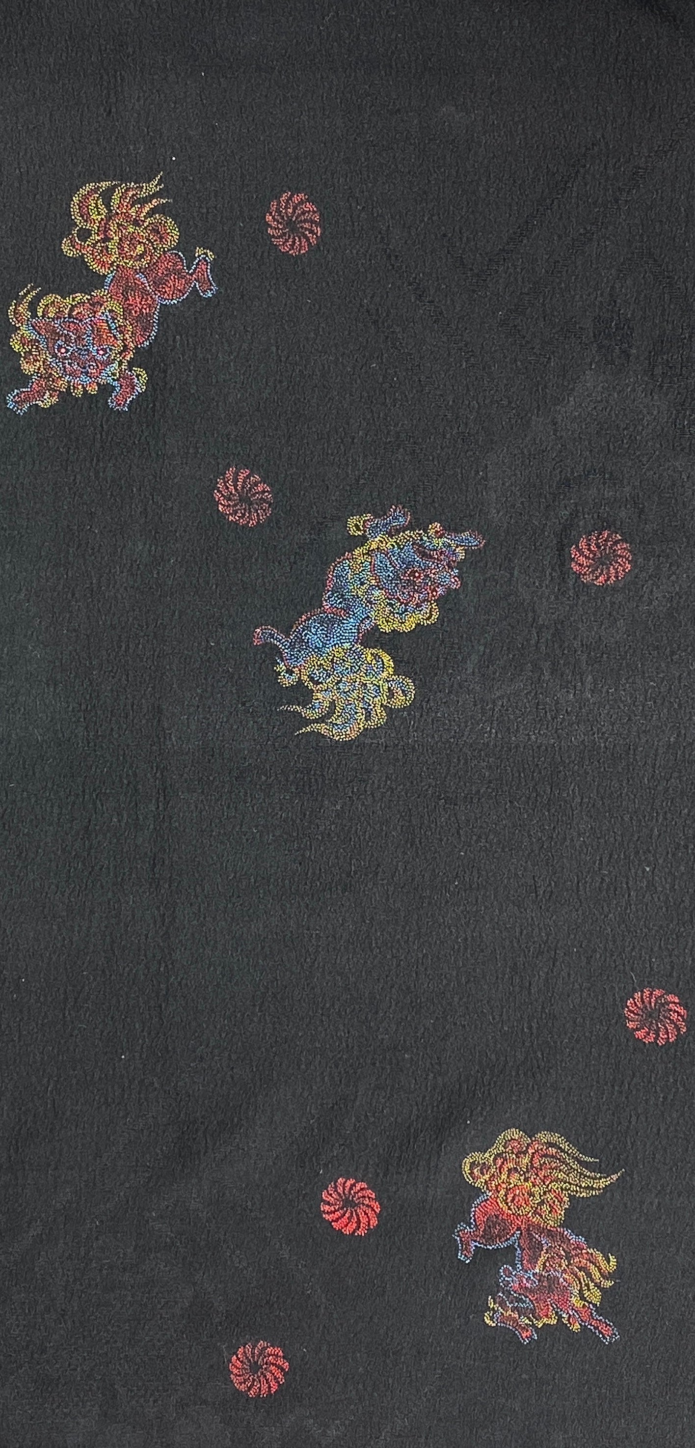 • Fabric & Pattern:  100% silk exterior and lining. The Haori is a jacket that is traditionally worn over Kimono. This Haori has Chinese Lions 'Shishi'  that are dyed with a colorful tiny dot pattern on a black damask base. It has an embroidered mon (family crest) on the nape