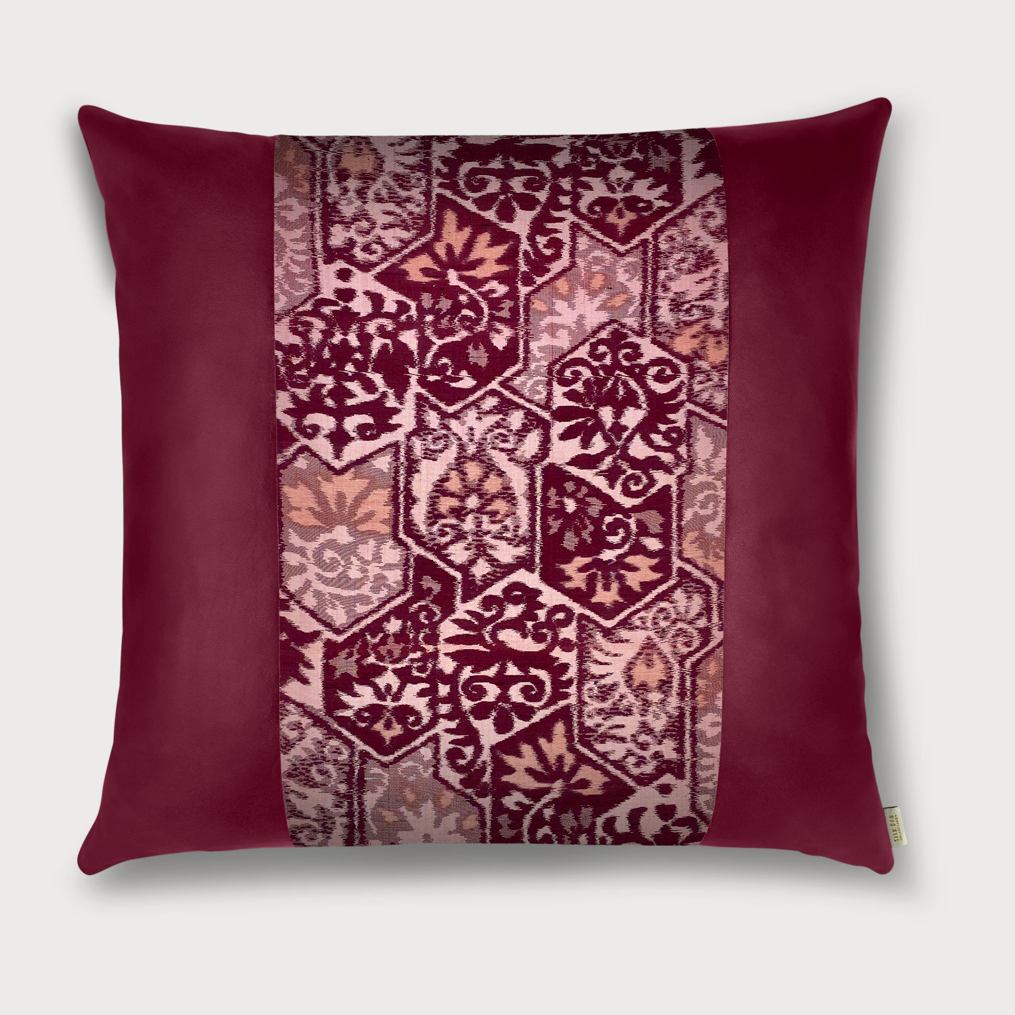 throw pillow with pink leather and burgundy silk, square 24x24"