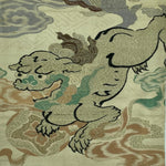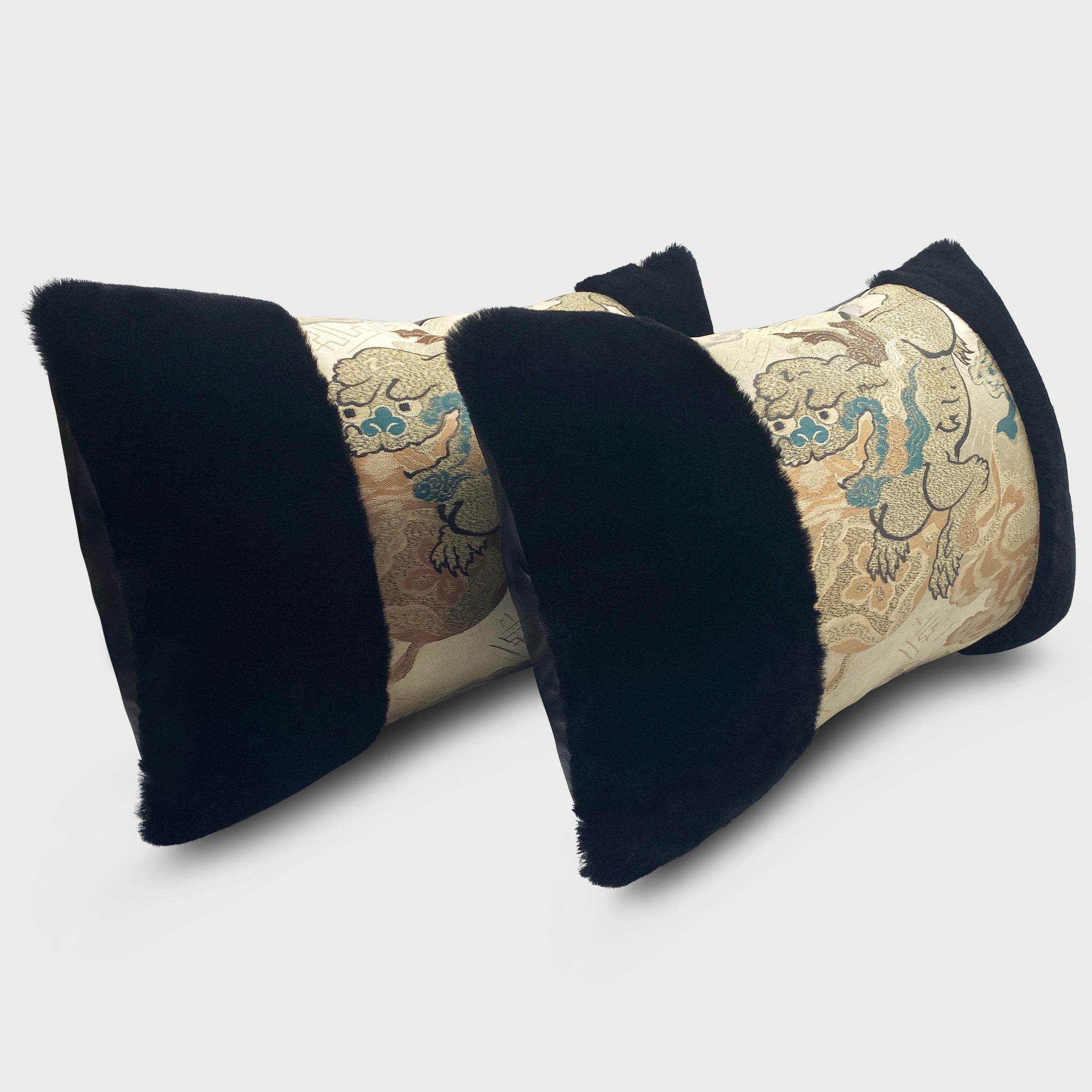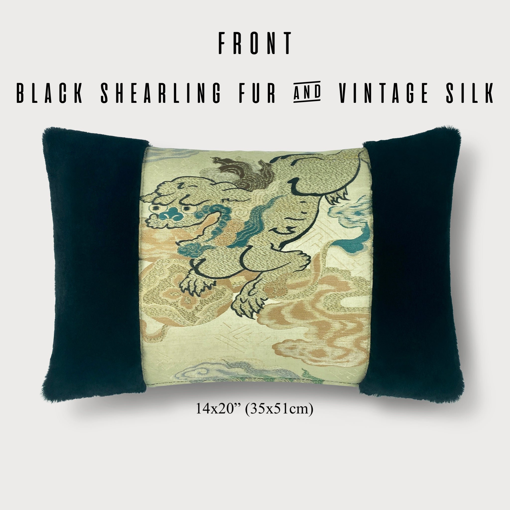 “Shishi”(狮子)和白云日本丝绸枕头(1912-1945),配黑色皮革和羊毛皮